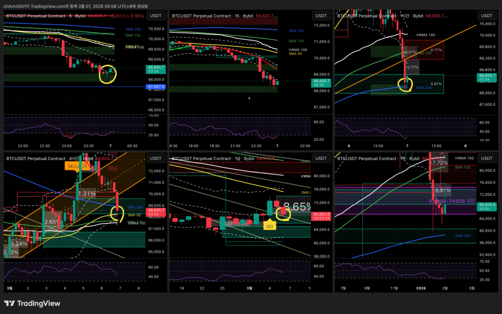 오늘은 오랜만에 비트코인 매수 타점을 어떻게 판단했는지, 그리고 그 결과는 어땠는지 보여드리고자 합니다. 위에 그림은 5분봉, 15분봉, 1시간봉, 4시간봉, 1일봉, 1주일봉이에요.