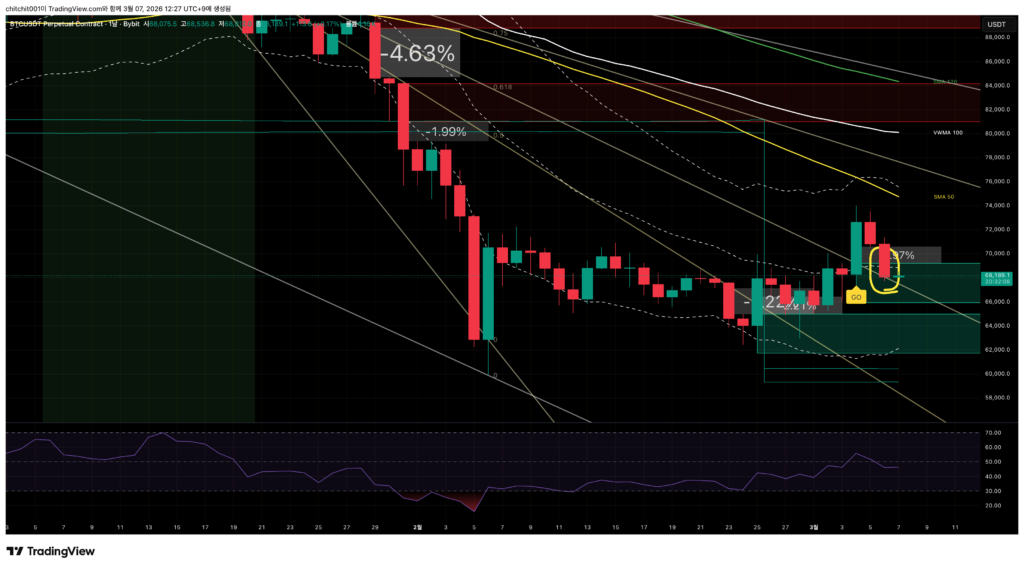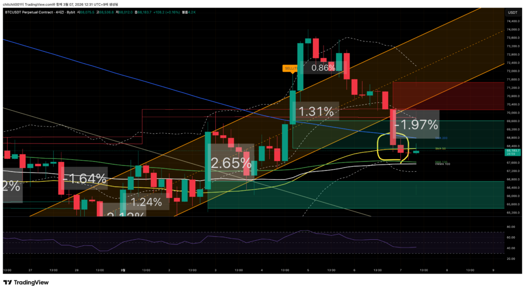 3. 4시간봉이 SMA 50 이평선에서 지지를 받고 있고 여기가 무너져도 SMA 120과 VWMA 100이 버티고 있어서 지지를 계속 받았을 것으로 예상