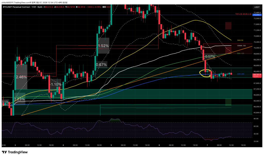 2. 1시간봉이 SMA 200 이평선을 계속 지지 받고 있음