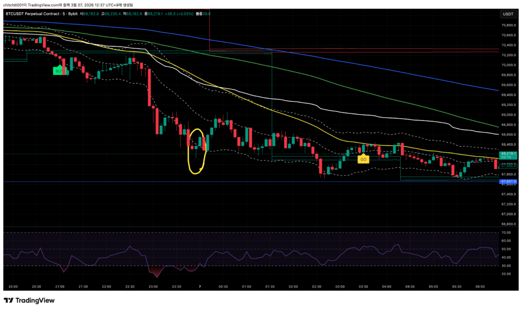 1. 5분봉이 켈트너 채널 하단에 있고 RSI가 30 근방