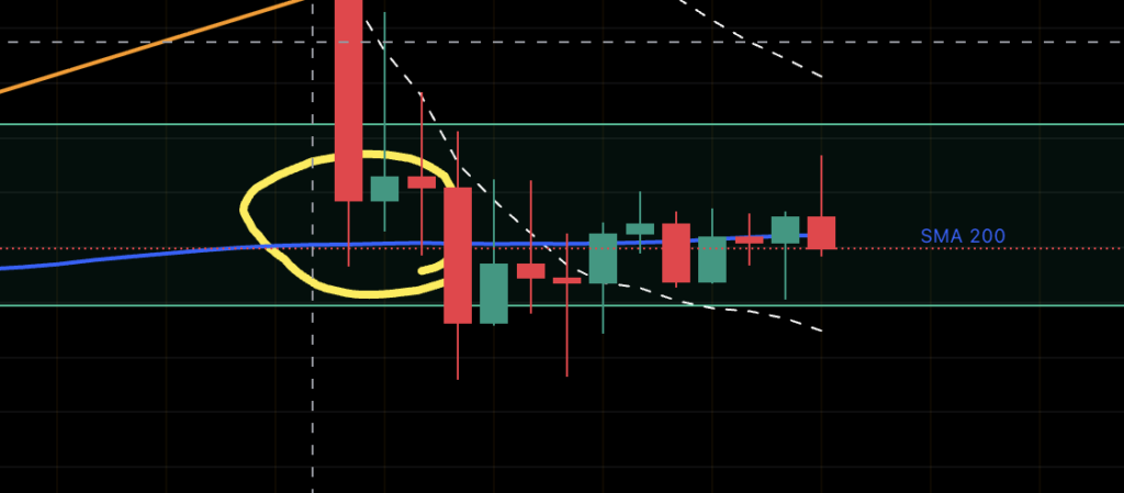 - 그리고 캔들이 떨어지면서 SMA 50을 터치했습니다. 여기서 반등을 줄 수도 있다는 희망을 가져볼 수 있겠죠.