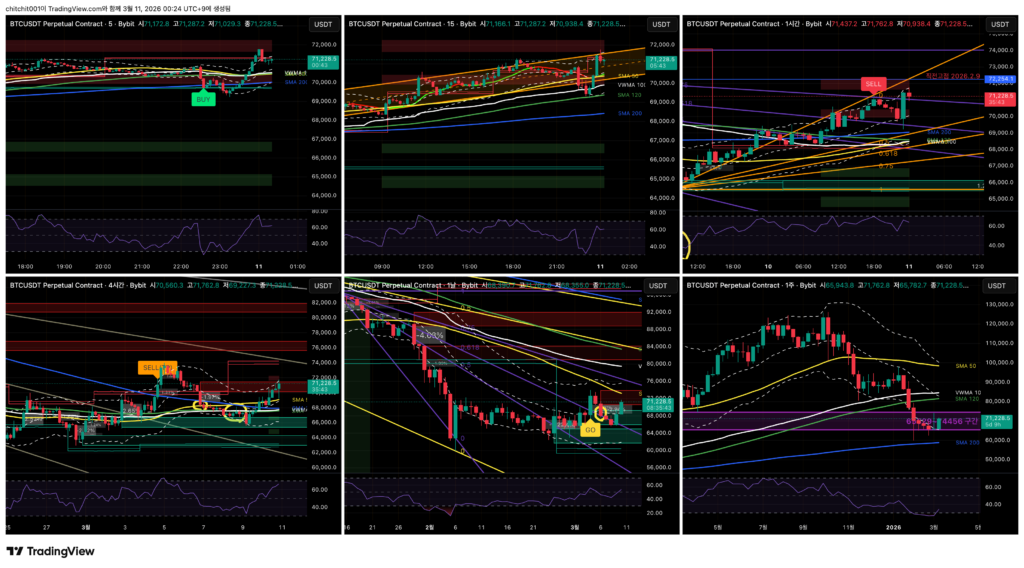 비트코인 종합차트입니다. (5분/15분/1시간/4시간/1일/1주일 순입니다.) 어지럽고 복잡하니 하나씩 보시죠.