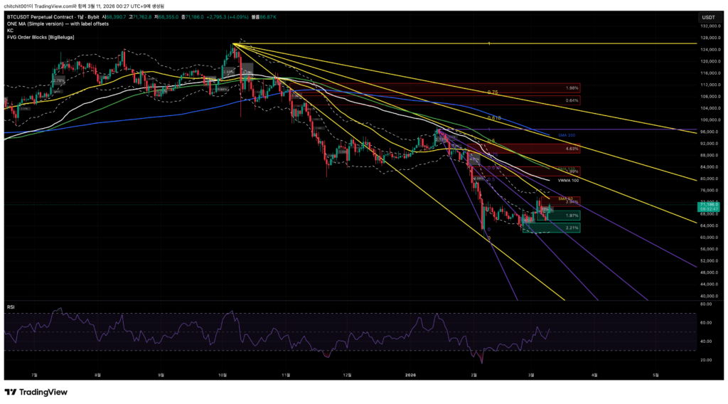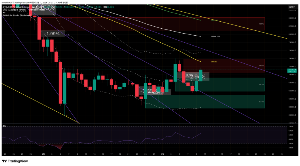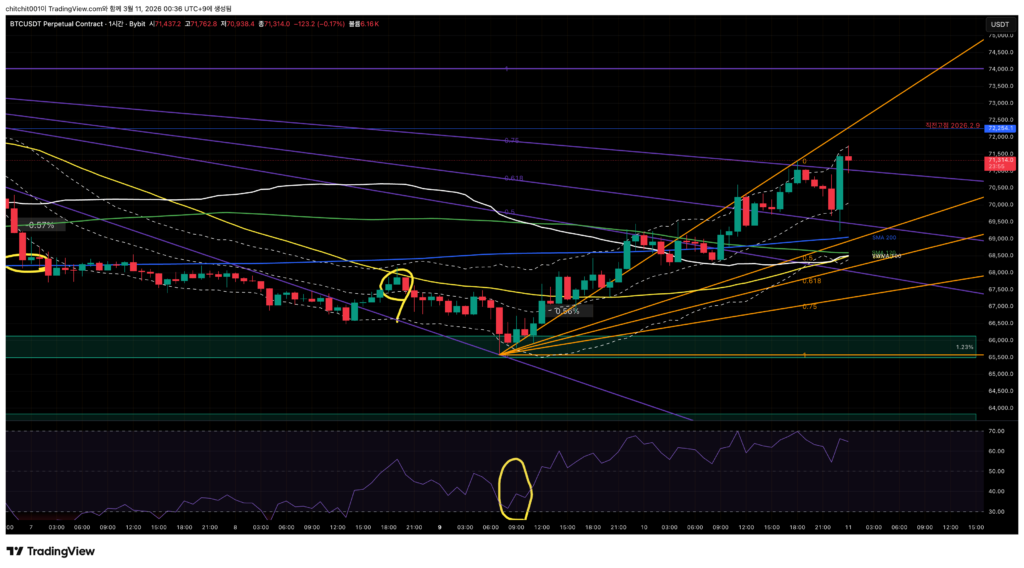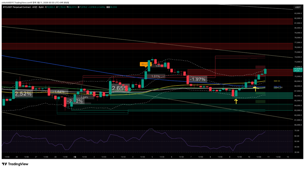 - 3월 9일 오전 9시부터 줄기차게 상승 중입니다. 이제 와서 못산 것을 후회한다면 남는 건 섣부른 진입에 따른 “물림”입니다. 매수 포모를 자제하시길 바래요. 여러번 말씀 드리지만 상승 패턴이 확실해지면 그 때 눌림 자리에서 들어가도 됩니다.