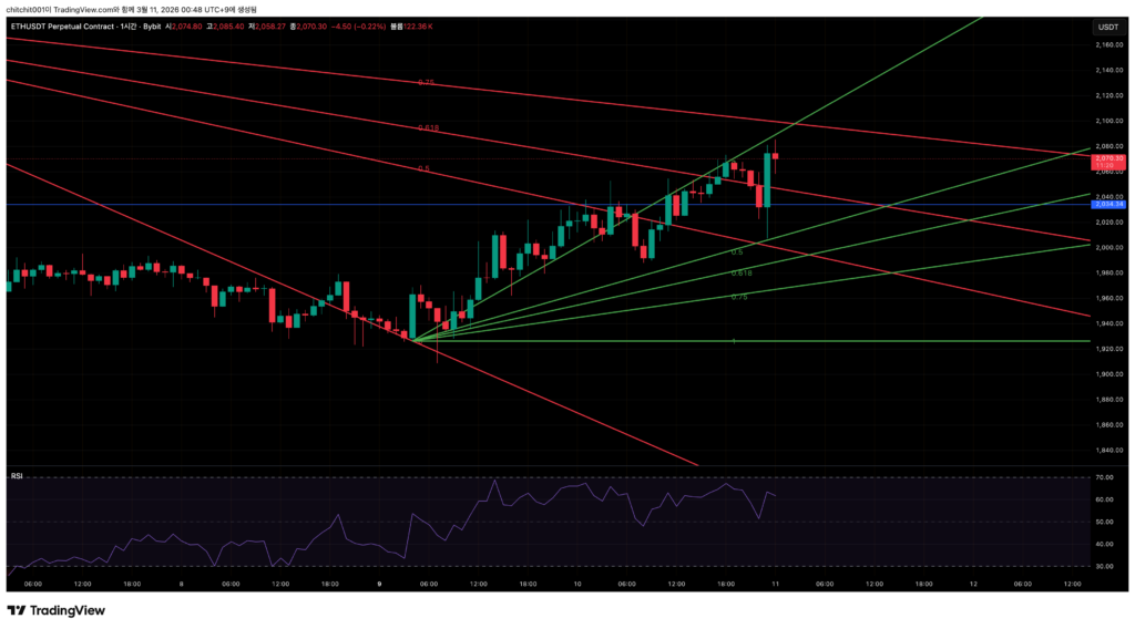 - 우선은 상승(녹색) 0.5선을 지지선 잡아 크게 상승을 했습니다. 그리고 현재는 다시 조정 중이네요.
