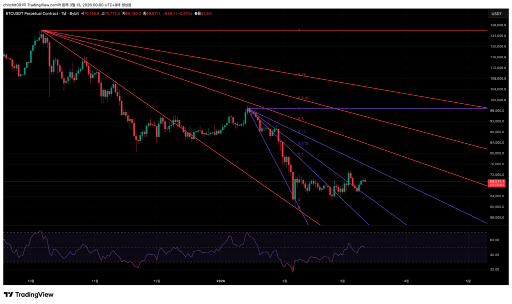 - 빨간색은 장기적인 관점의 하락 스피드팬이고요. 보라색은 단기적인 관점의 하락 스피드팬입니다.