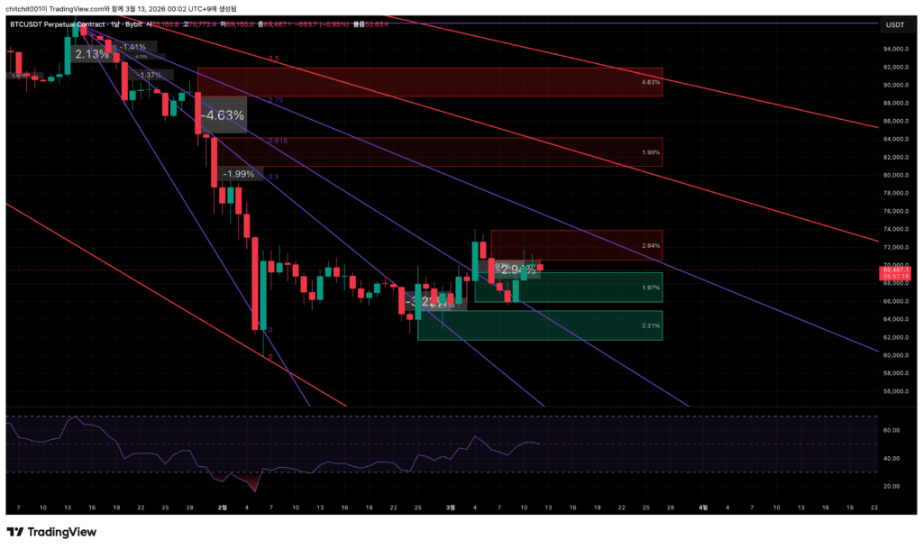 - 약 한달 전 급락 때문에 생긴 FVG 구간(7.72%, 5.61%)이 근처까지 왔습니다. 만약 캔들이 여기까지 온다면 장기적인 관점에서는 위로 오를 확률이 더 크겠죠.