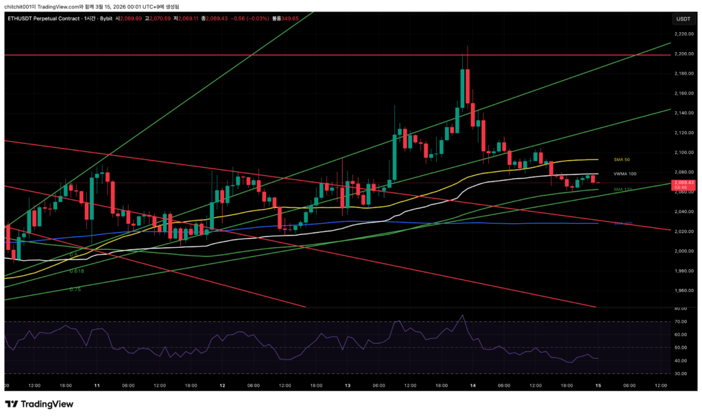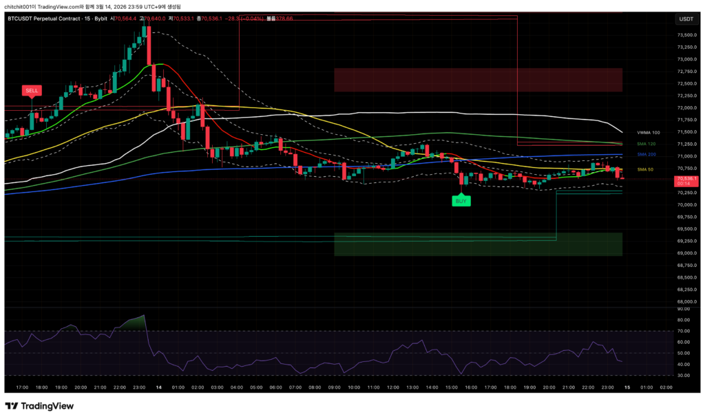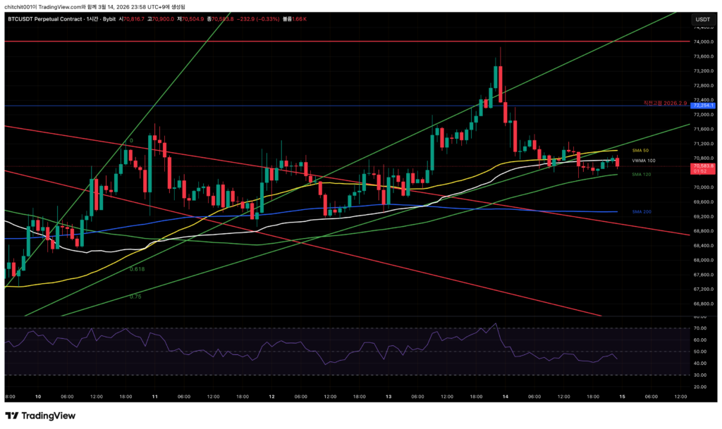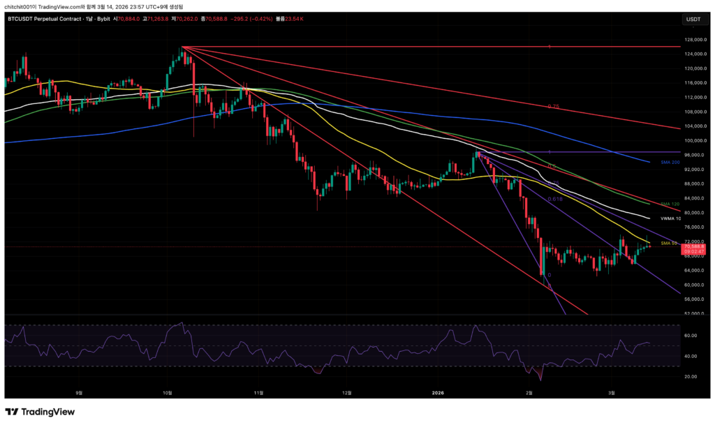- 상승 스피드팬의 0.75구간, SMA 50/120, VWMA 100까지 몰려 있습니다.