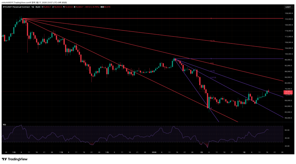 - 보라색 하락 스피드팬의 0.75구간을 넘었고 오늘은 다시 그 선에 닿아 있는 상황입니다. 며칠내로 이 선을 크게 통과하면 1주일 봉과 함께 긍정적인 시그널로 볼 수 있겠죠