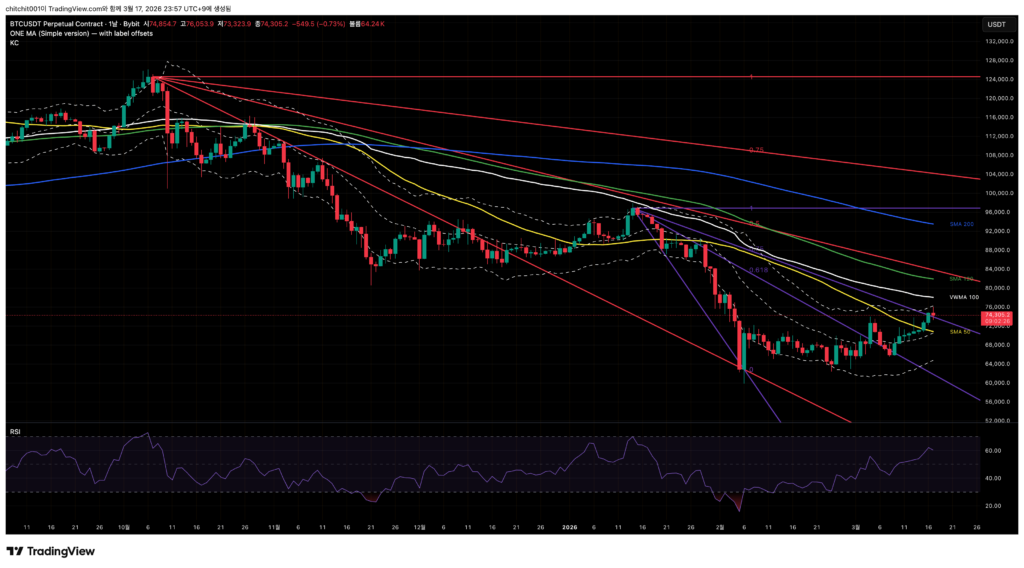 - SMA 50과 VWMA 100이 데드크로스를 했습니다. 단기 관점에서는 내릴 가능성이 있죠. 그 이야기는 눌림이 생길 가능성이 있다는 것입니다.