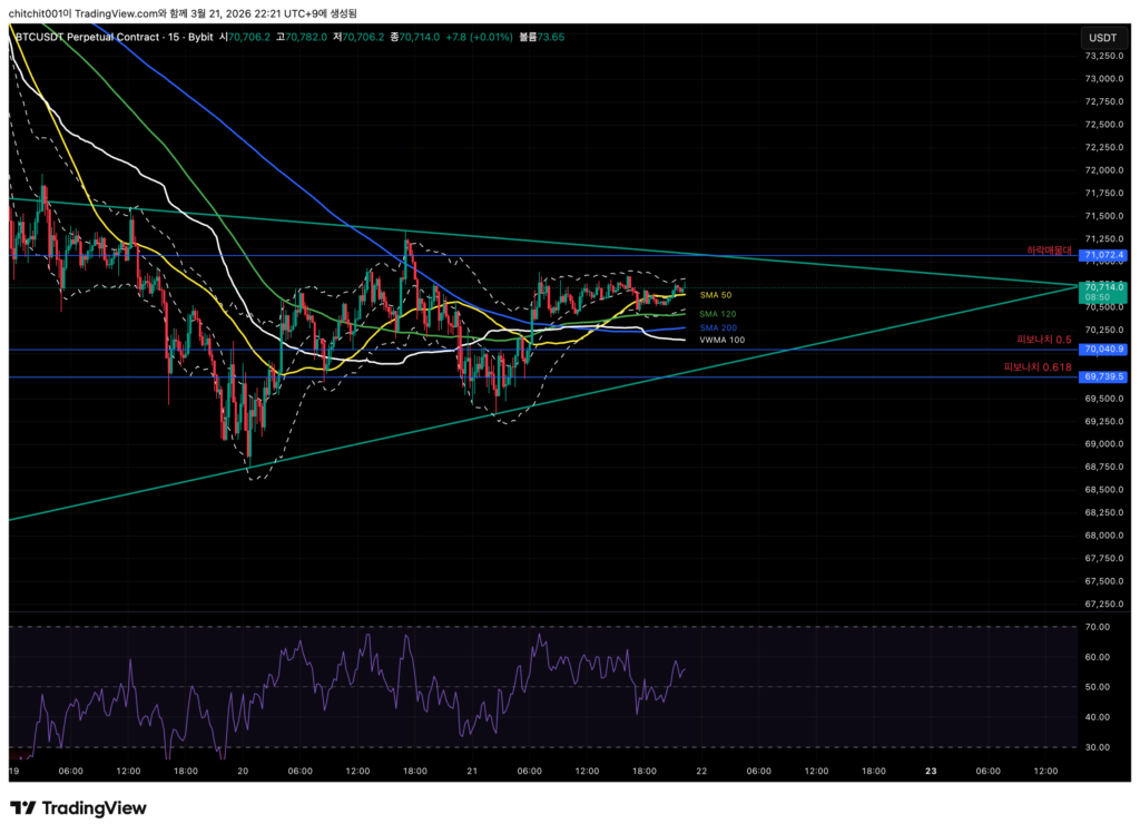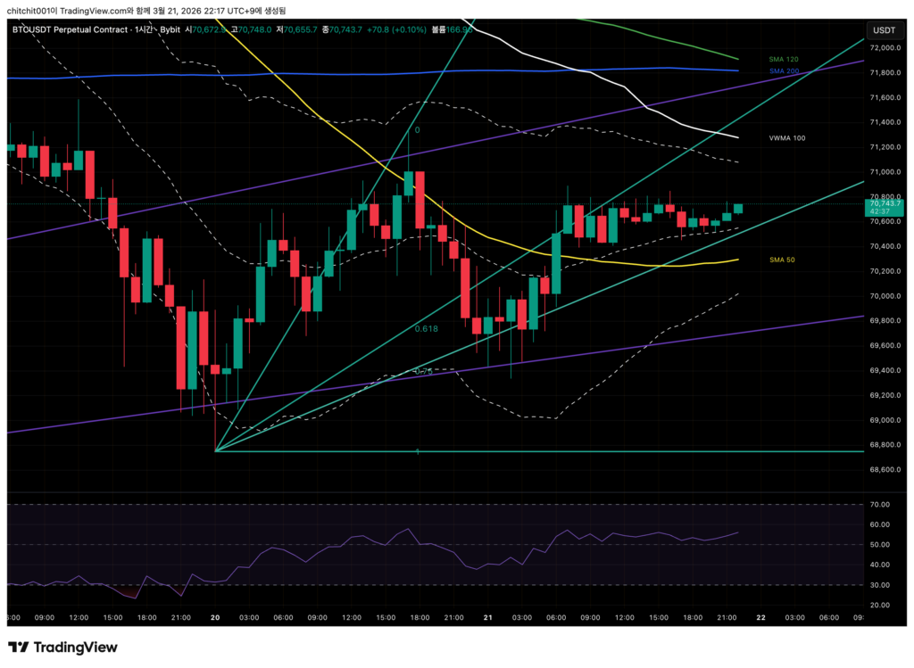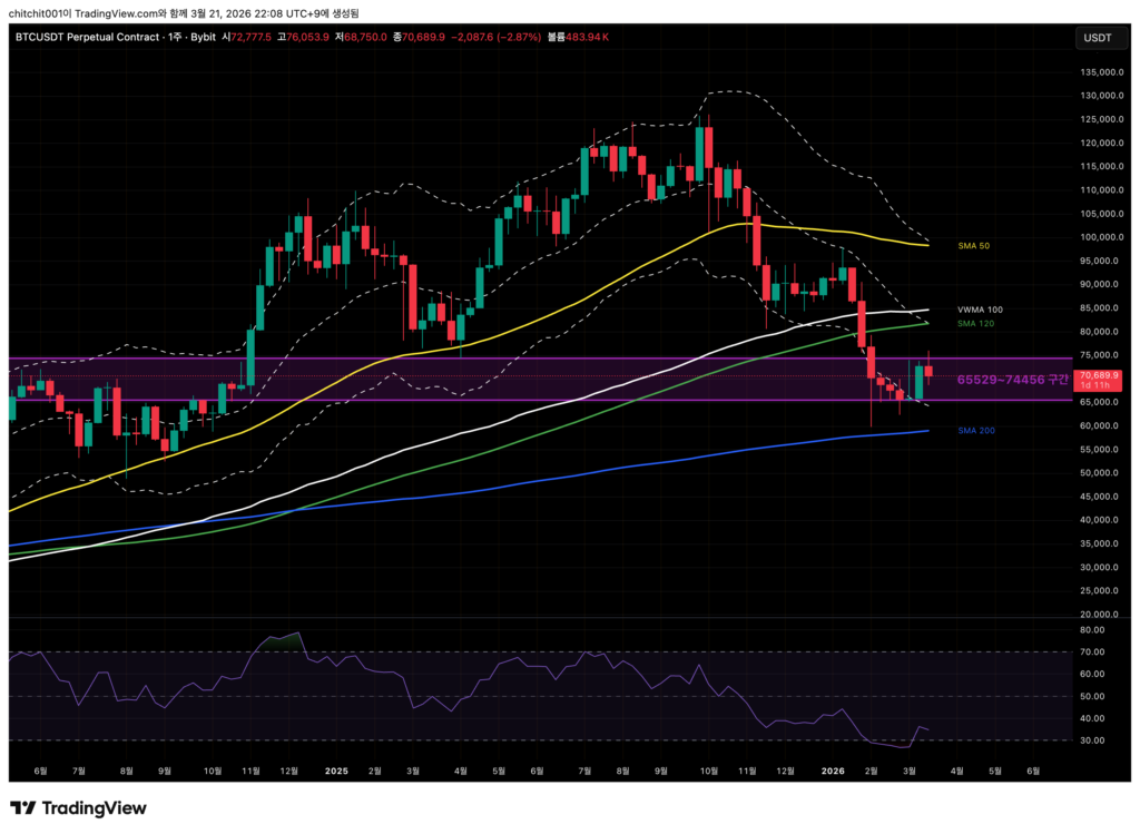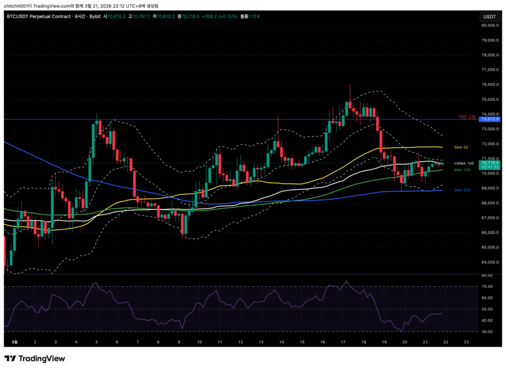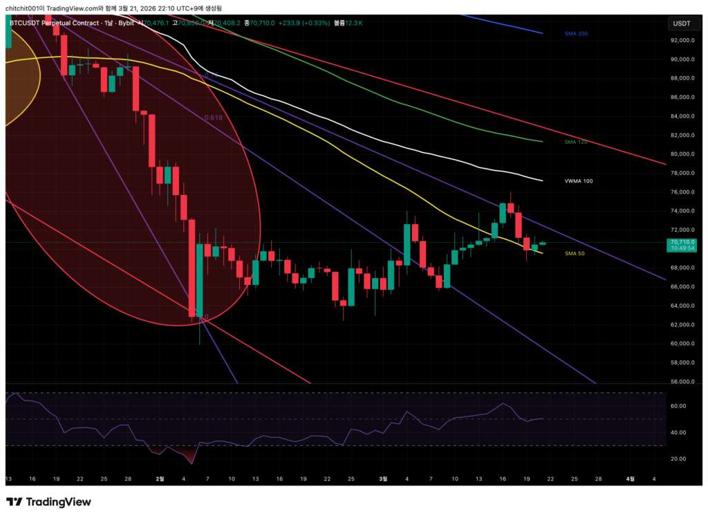 - SMA 50을 꾸역꾸역 지키고 있죠. 더 이상 크게 떨어지지만 않는다면 지금 시점은 중요한 눌림목이 되는 자리입니다. 상승에 배팅을 한다면 지금 들어가서 어제 양봉 하단(69,810달러)에 손절을 걸고 들어가봐도 좋겠네요