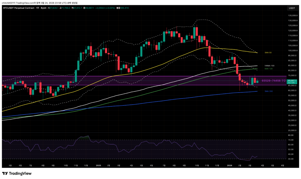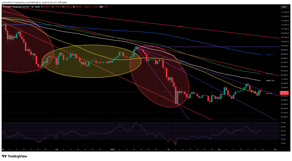 - 지금은 SMA 50, 120, VWMA 100이 뭉친 지점에서 횡보 중이죠. 방향으로 볼 때는 아래가 좀 더 맞지 않을까 싶네요.