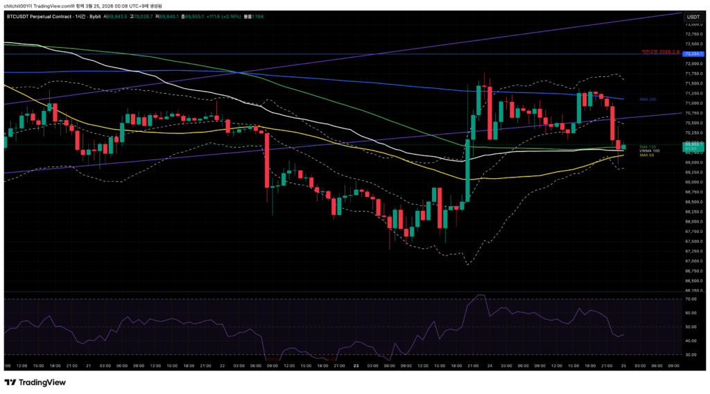 - 큰 프레임에서는 하락을 하는게 맞는데 1시간 프레임으로 오면 SMA 50, 120, VWMA 100이 지지하려고 기다리고 있습니다.