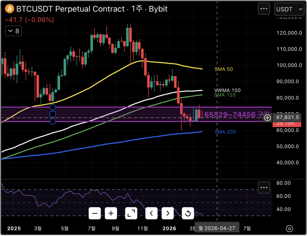 비트코인 1주일 봉입니다. 보라색 구간은 이전에 넥라인으로 작용했던 중요한 구간인데요. 지지난 주의 상승분을 거의 다 반납했습니아. 여기를 뚫어줘야지 다시 상승을 봤을텐데 아쉽네요.