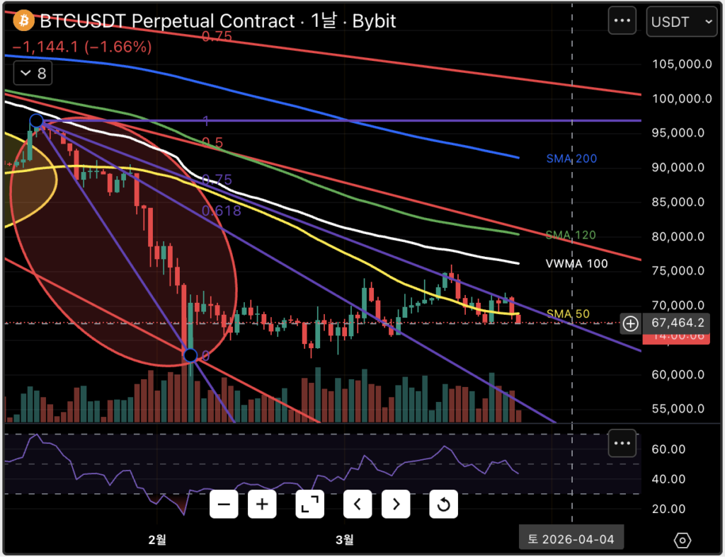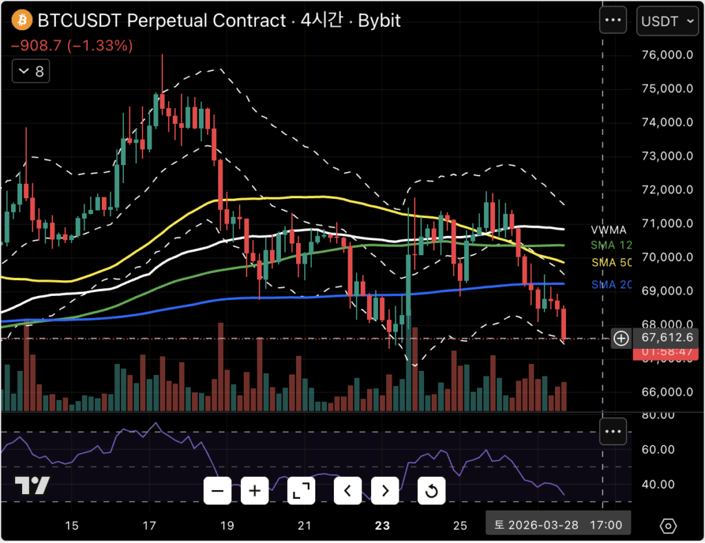 비트코인 1일 봉입니다. SMA 50을 간신히 지키는가 싶더니 결국 무너졌습니다. 이제는 하락을 보는게 맞을 것 같네요.