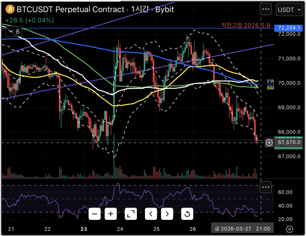 비트코인 1시간 봉입니다. 마찬가지로 하락의 연속이고 타점도 잘 안보이네요.