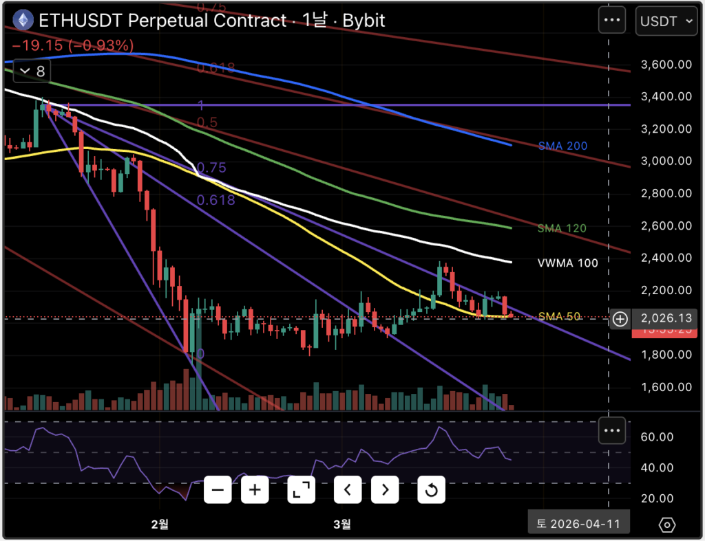 이더리움 1일 봉입니다. 하락 스피드팬은 결국 넘지 못했고요. SMA 50에서 지지를 받고 있는데 내일 오전 9시 마감까지 버틸 수 있을지도 모르겠습니다. 어렵군요.