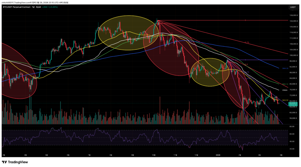 비트코인 1일 봉입니다. 노란색 횡보 후 빨간색 하락 패턴 보이시죠? 현재도 횡보가 이어지고 있고요. 떨어지기 좋은 상태를 만들어 가는 모습입니다. SMA 50도 무너진 상황이라 상스잉 쉽지 않아 보이네요.
