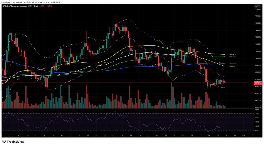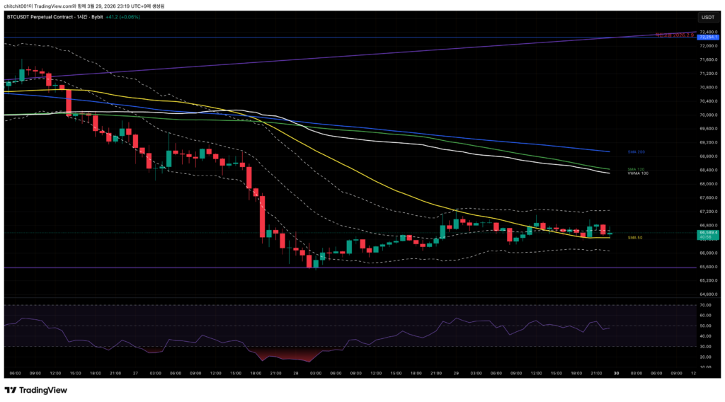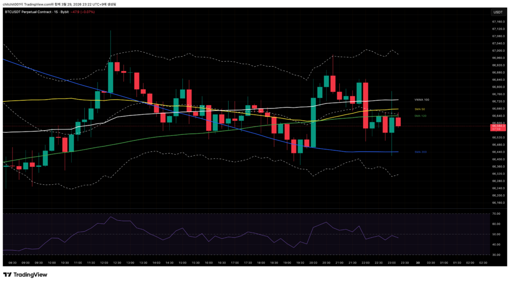 비트코인 15분 봉입니다. SMA 200만 동떨어져 있고 SMA 50/120, VWMA 100가 뭉쳐 있습니다. 오늘 저녁에 위/아래 방향이 결정될 모습이네요.