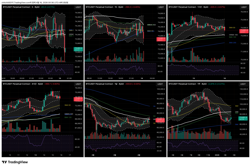 비트코인 종합차트입니다. 왼쪽 위부터 Z 방향으로 5분봉/15분봉/1시간봉/4시간봉/1일봉/1주일봉입니다.