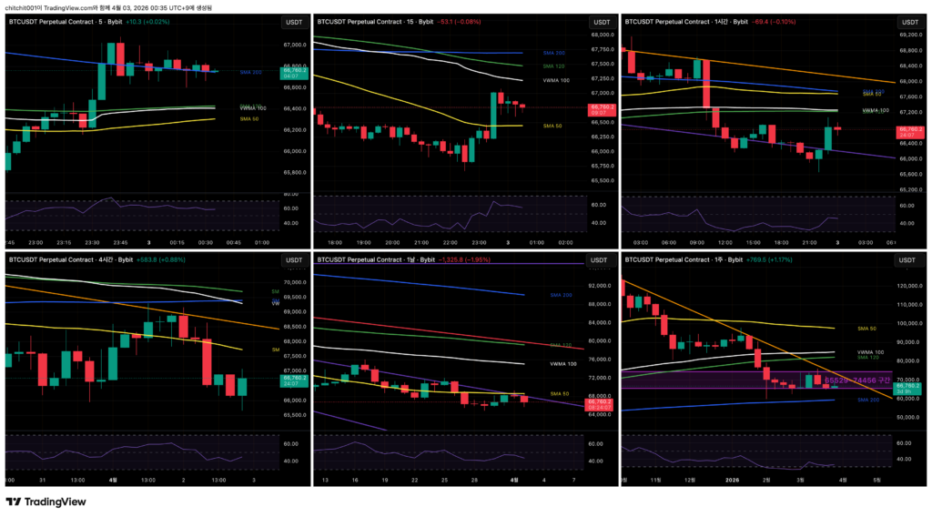 비트코인 종합차트입니다. Z방향으로 5분봉/15분봉/1시간봉/4시간봉/1일봉/1주일봉입니다.