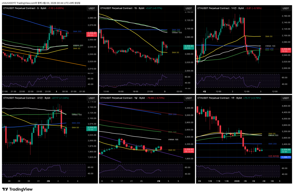 - 15분봉은 특별히 이평선의 지지나 저항을 받는 구간은 아닌데요. 굳이 따지자면 SMA 50이 마지막 지지선이니 이 부근에서 상승에 배팅을 해보면 어떨까요? 대략 2044달러 근처네요